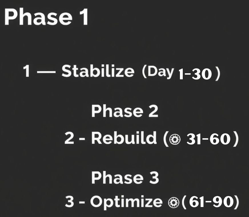 Uses a structured 90-day progression: Stabilize → Rebuild → Optimize