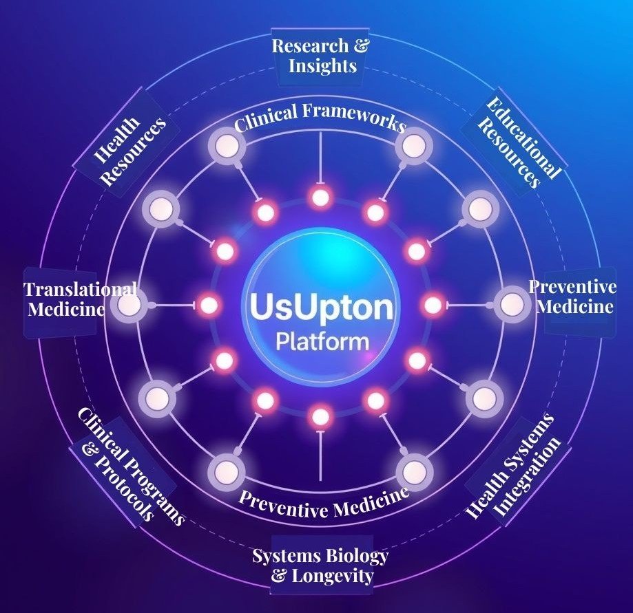 The UsUpton Platform extends beyond individual health domains, forming a comprehensive ecosystem of research, education, clinical frameworks, and long-term preventive medicine strategies.